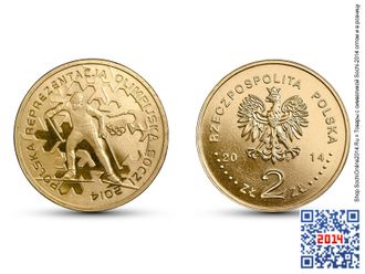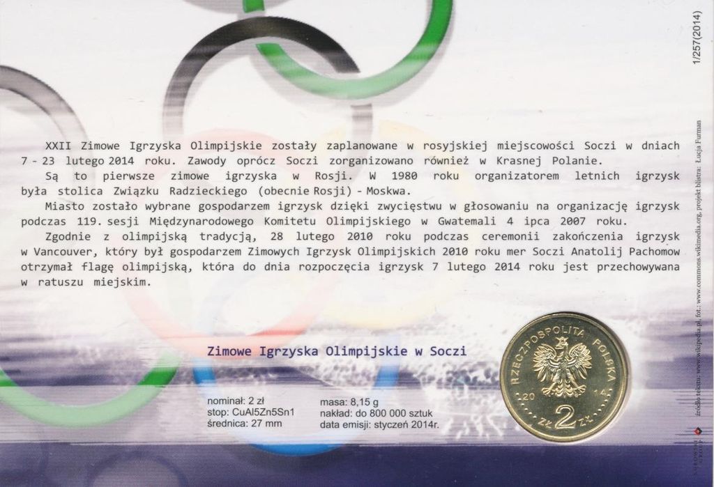 Памятная юбилейная монета номиналов в 2 злотых (ZL) посвящена 22-ым зимним Олимпийским играм в Сочи выпущена национальным банком Польши в 2014 году. Внимание: монета находится в частной коллекции в Москве и Кудрово (ЛО).