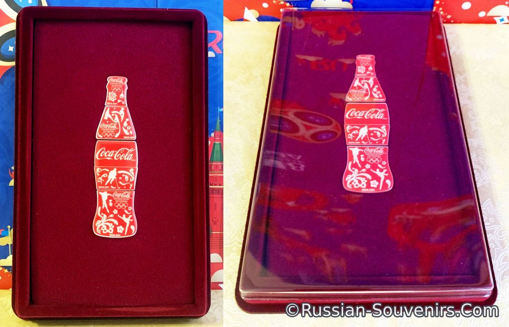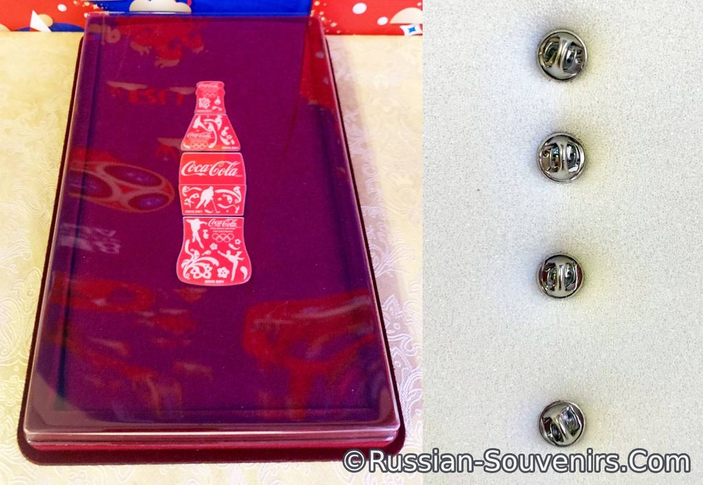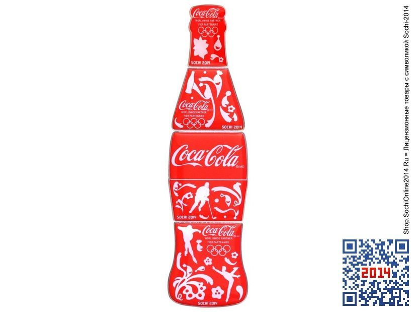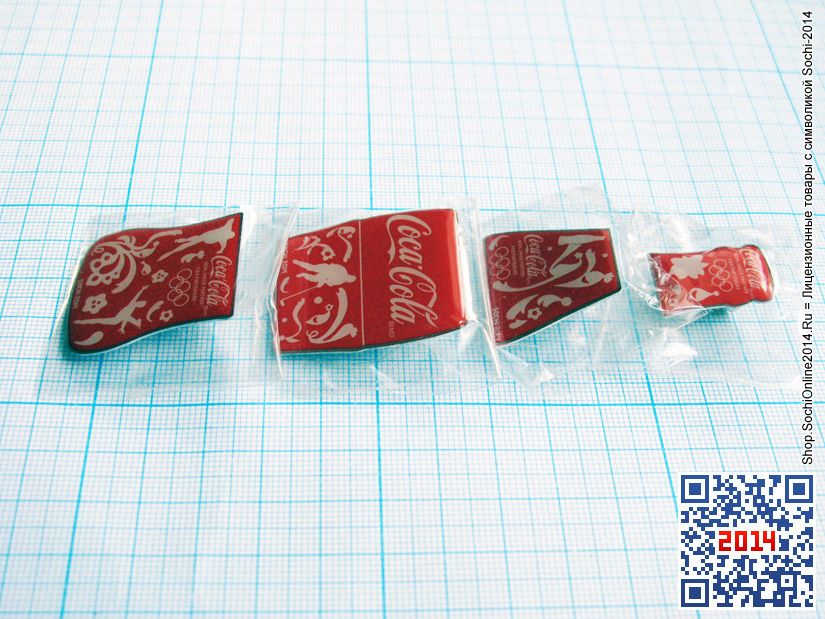 Набор из 4-х значков Сочи-2014 в виде стилизованной «бутылки» Кока-Кола и подарочном флокированном красном планшете с прозрачной крышкой порадует любого коллекционера Олимпийской «сочинской» символики. Такой набор можно купить в подарок как любителю-«собирателю» значков (школьнику, студенту), так и профессиональному коллекционеру. Данный набор — очень редкий раритет для тех «у кого уже всё есть».