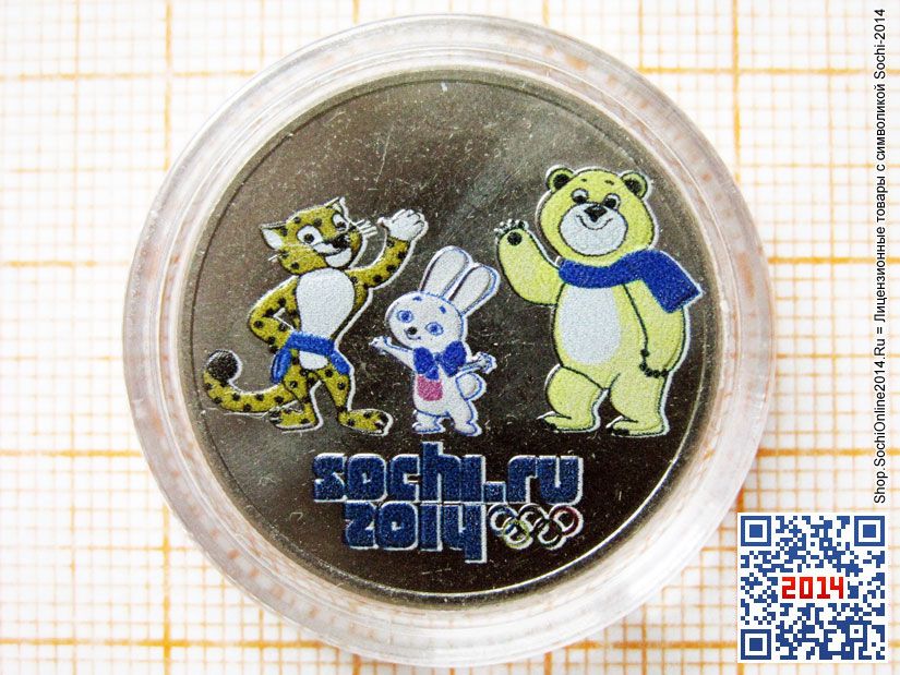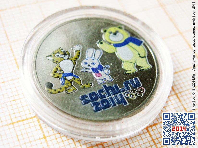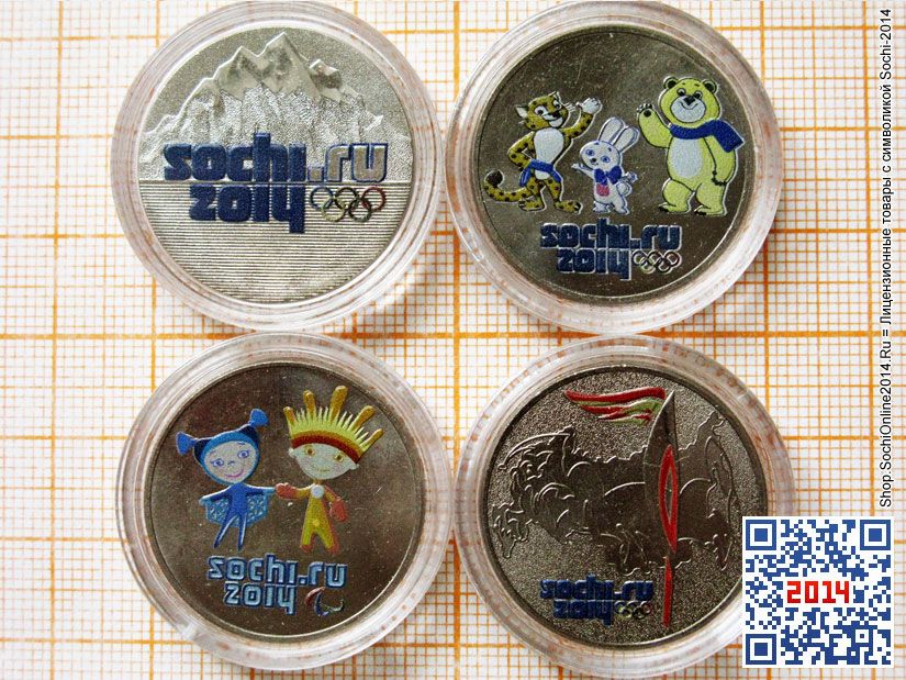 Недорогая альтернатива официальным цветным монетам Сочи-2014! Изготовлены из настоящих официальных монет Олимпиады-2014 номиналом 25 рублей, только окрашенных цветной эмалью (частный выпуск, очень малый тираж). Монеты заключены в специальные прозрачные капсулы, см. фото) либо в подарочную упаковку в картонном альбоме-буклете или в «флокированном» планшете синего или красного (бордо) цветов с купюрой.