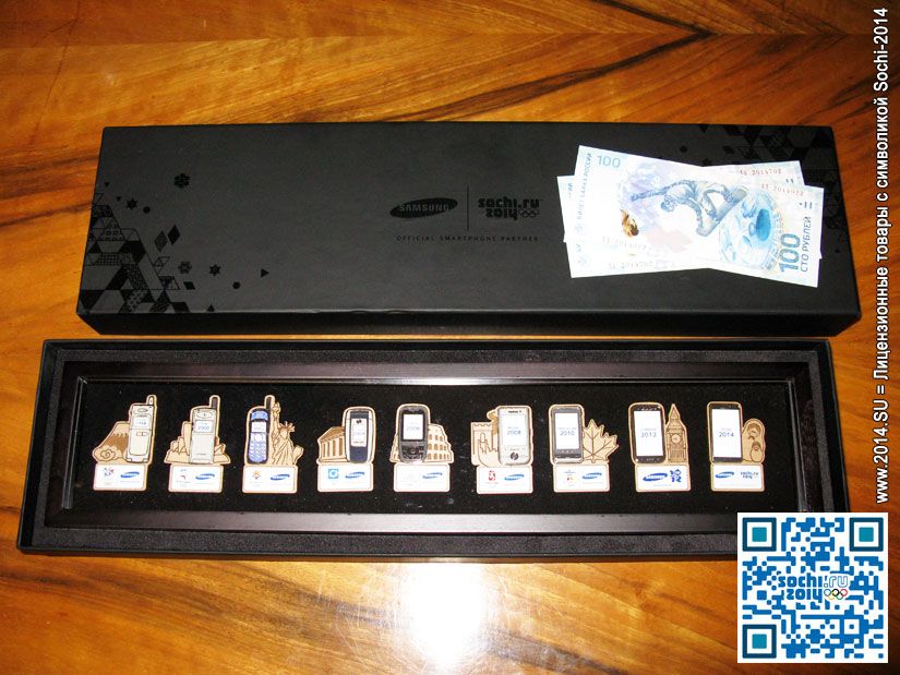 Редчайший набор значков от генерального партнера МОК, компании «Самсунг» (Южная Корея). Набор значков в кол-ве 9 шт находится в деревянном футляре с лицевой панелью из прозрачного пластика (также футляр можно установить вертикально — для этого в его задней стенки встроена специальная подставка и винтовой разъем для ее закрепления). Сам же футляр, в свою очередь, хранится в собственной коробке с символикой «Sochi 2014» (см. фото).