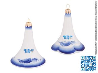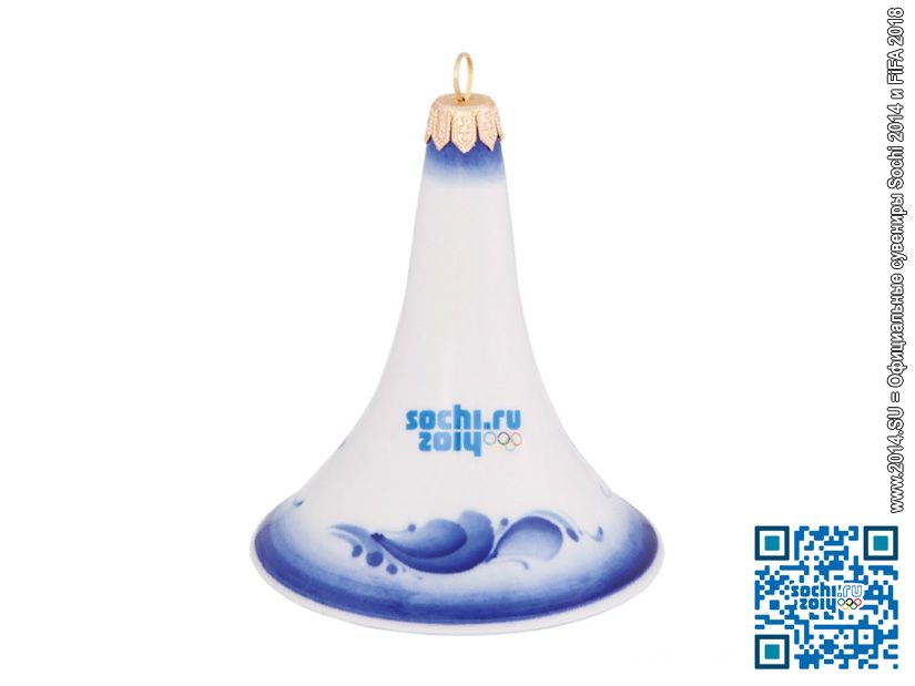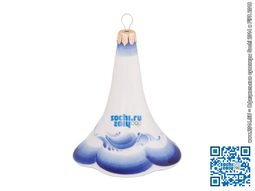 Официальная лицензионная елочная игрушка в форме колокольчика из фарфора с ручной кобальтовой росписью «Гжель» с символикой XXII зимних Олимпийских игр в Сочи в 2014 году! Логотип Олимпиады Sochi 2014 нанесен с помощью деколи. Новогодняя игрушка поставляется «под заказ», срок поставки согласовывается индивидуально по каждому заказу.