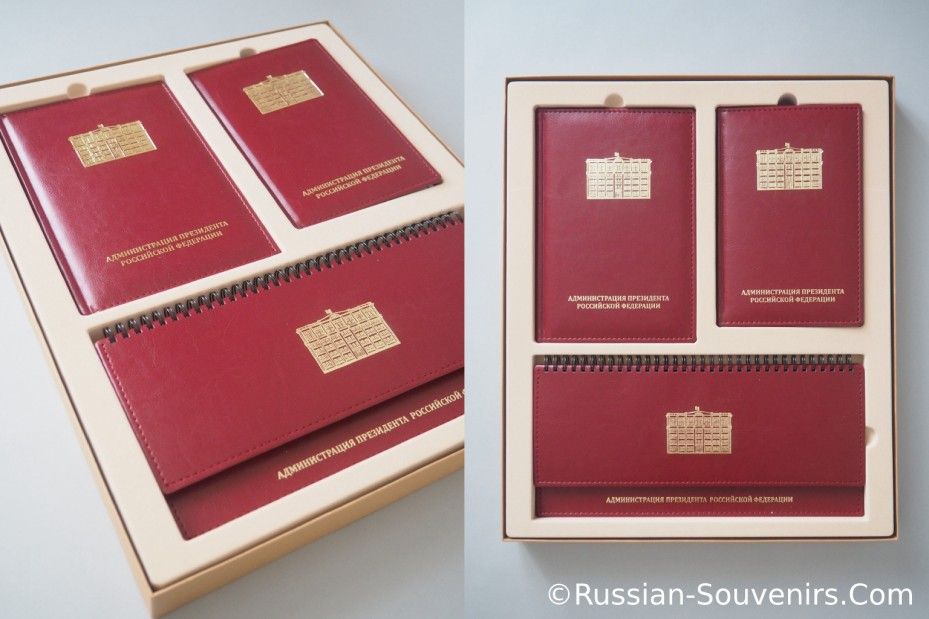 Набор укакован в бежевый ложемент и красивую представительную коробку из темно-красного картона с золотым тиснением и официальной эмблемой Администрации Президента РФ. Подарочный пакет поставляется отдельно, купить его можно здесь >>