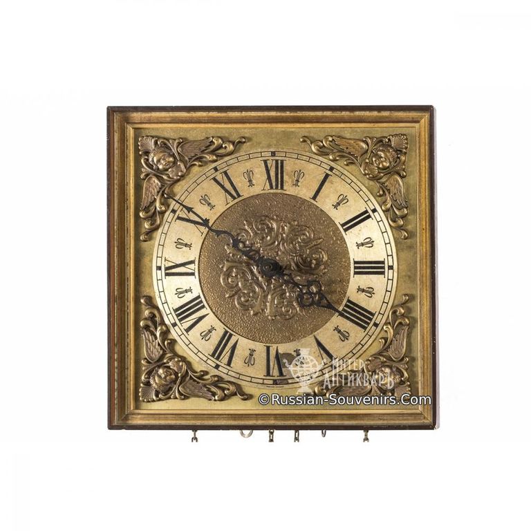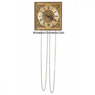 Предлагаемые антикварные часы имеют гиревой привод часового механизма с тонкими цепочками. В углах лицевой панели часов размещены накладные барельефы с узорами ангелочков в переплетении листьев. Классический циферблат с римскими цифрами имеет утонченне фигурные стрелки.