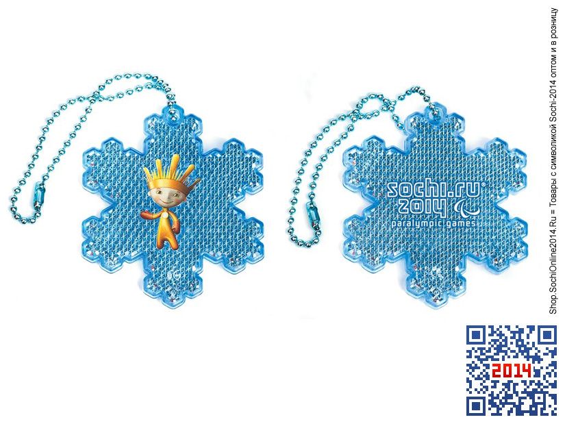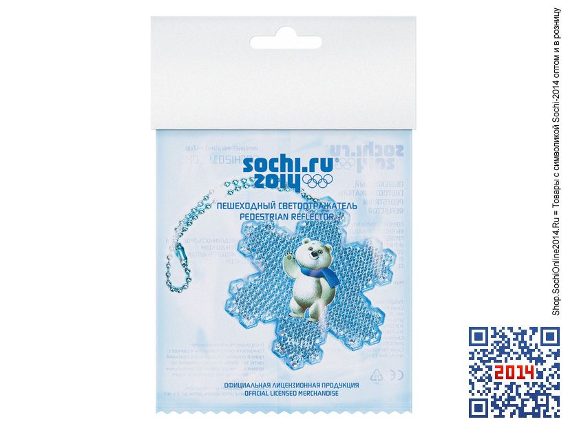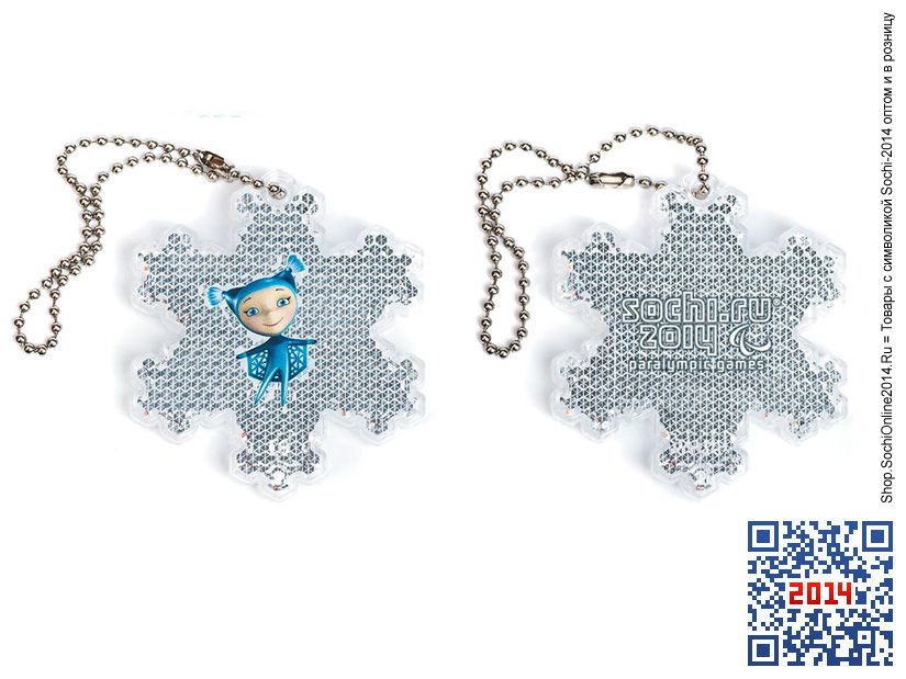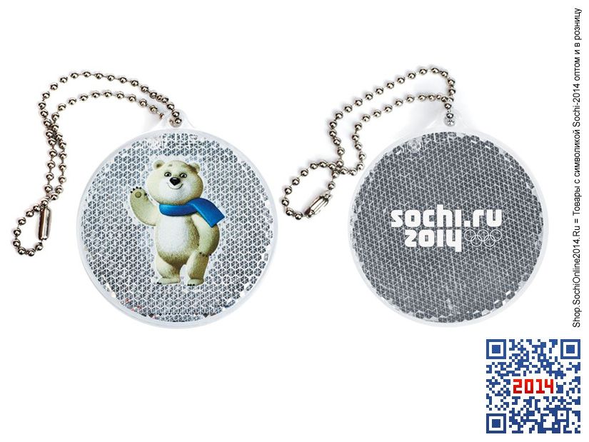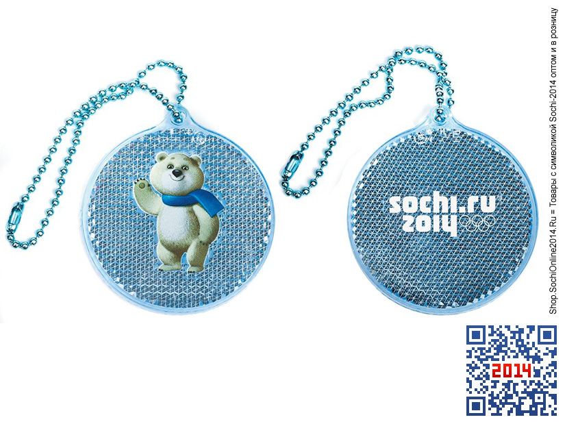 Пешеходный светоотражающий брелок-фликер (катафот) с Олимпийской символикой «Сочи-2014» крепится на одежду (сумку, рюкзах, школьный ранец) с помощью цепочки и позволяет водителю издалека заметить пешехода в темное время суток и в плохую погоду.