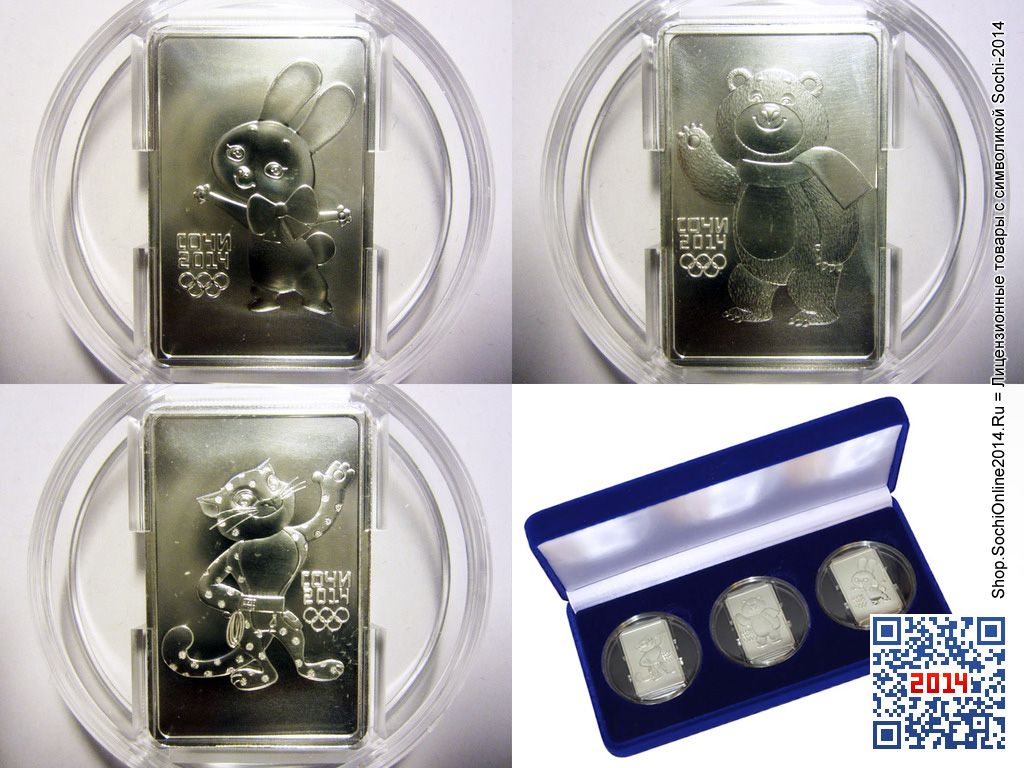 Предлагаем купить набор инвестиционных серебряных монет-слитков «Талисманы Олимпиады-2014 в Сочи». В наборе 3 прямоугольных монеты из чистого серебра 999-й пробы. Предлагаемые юбилейные монеты являются отличным вариантом для инвестиций в будущее Ваших детей, подарком для близких и бизнес-партнеров и памятной семейной реликвией. Внимание! Монеты имеют лимитированный тираж и в любой момент могут закончиться! Спешите купить!