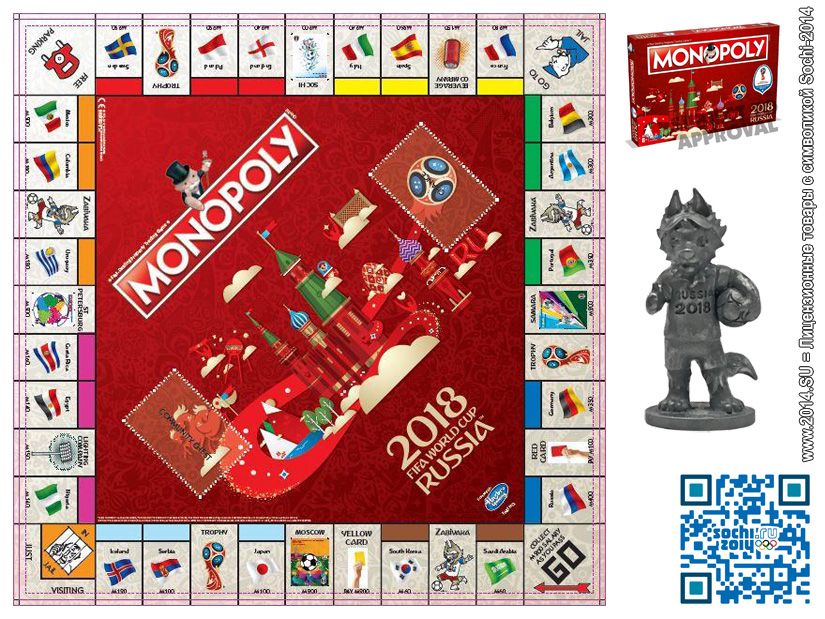 Легендарная настольная игра в футбольной символике «мундиаля» ФИФА 2018 (лицензия «FIFA WORLD CUP RUSSIA» совместно с фирмой «Хасбро») с эксклюзивной фигуркой талисмана-волка «Забиваки». Классическая оригинальная «Monopoly» изобретена в США в 1934 году и стала в Штатах самой продаваемой игрой — в настоящее время с собственным мировым первенством и полмиллиардом играющих во всем мире. Во времена СССР данная «настолка» впервые была замечена на пост-советском пространстве примерно(?) в 70..80-х годах XX века.